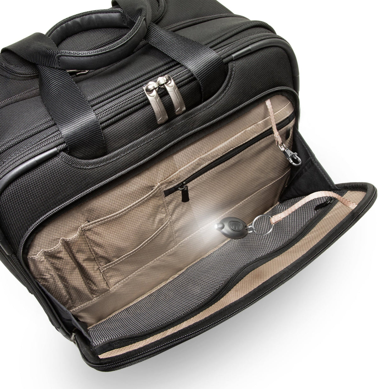 Crafted for durability and convenience, ideal for on-the-go professionals and travelers. Built with tough 1680D ballistic nylon treated with Nanotex®, it resists stains and water. Features include YYK® EYL zippers, a 42" telescoping handle, robust inline skate wheels, and protective pockets. Inside, find a quilted laptop pocket, organized compartments, and a tip-out tech section—perfect for seamless travel organization and enduring style. With its thoughtful design, this boarding bag is the perfect blend of durability, functionality, and style for travel-savvy individuals.