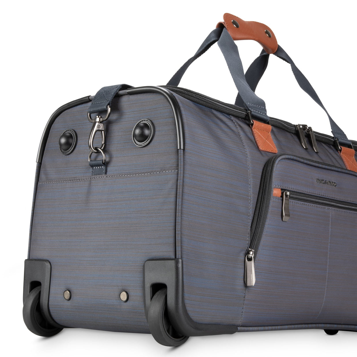 Crafted for your comfort, this durable duffel rolls smoothly and offers a roomy interior for easy packing. Enjoy the convenience of three versatile carrying options, along with well-placed pockets inside and out to keep you organized. Plus, the attractive faux-leather trim adds a touch of sophistication to your journey.
