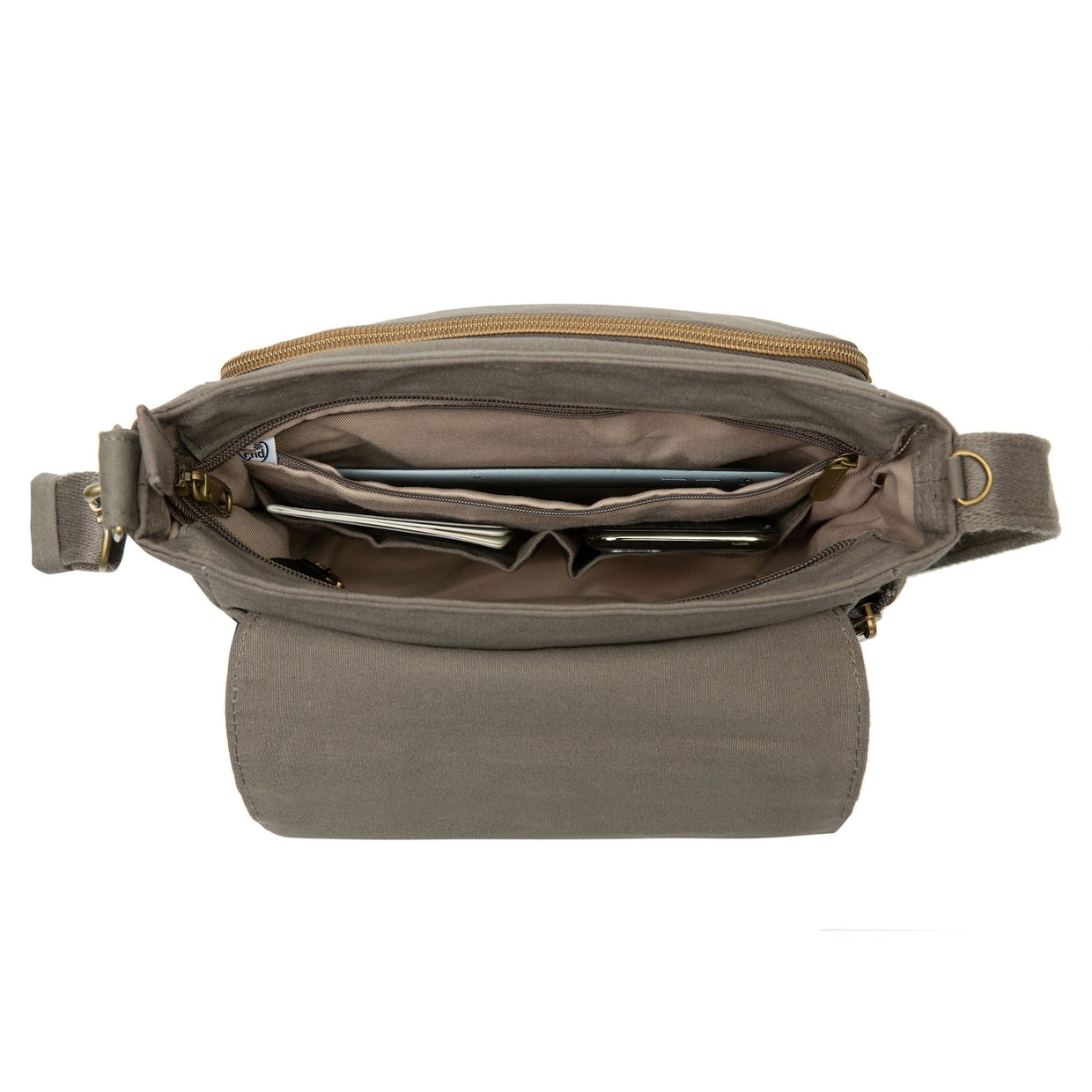Authentic, vintage styling with added security. The Courier Tour bag is both iconic and versatile with a distinct and easy look. A minimalist dream, functional and durable, made of water and dirt-resistant canvas with genuine leather accents, antique brass hardware look, thoughtful organizational features throughout, and built-in security system. Now you can stop watching your bag and look up to see the world in front of you. Travelon's built-in 5-Point Anti-Theft security system will protect your valuables from pickpockets and thieves. Includes slash-resistant mesh barrier in all 4 sides and bottom body panels; slash-resistant and lock-down strap; locking compartments, and RFID blocking organizer. Travelon packs your bag with peace of mind.